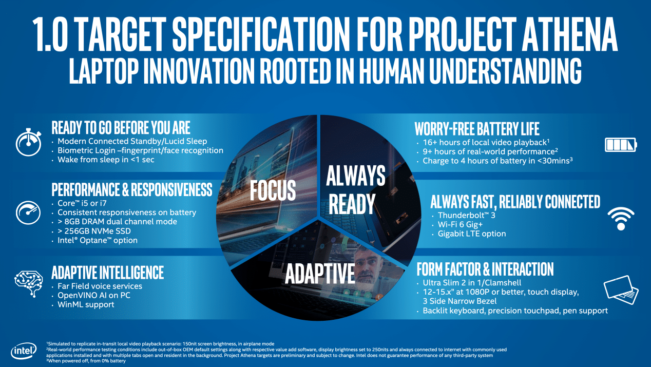由英特尔(Intel)发起的迅驰与超级本技术不仅推动了前两次笔电革命,也为各品牌厂及组件厂奠定了笔记本电脑的技术趋势。雅典娜计划(Project Athena)秉持着创新精神,轻松突破过往笔记本电脑所需的速度与轻薄技术,再结合人工智能等新科技,让使用者可依据自身使用习惯真正地打造出专属的个性化笔记本,并应用在各种生活与工作场景之中。