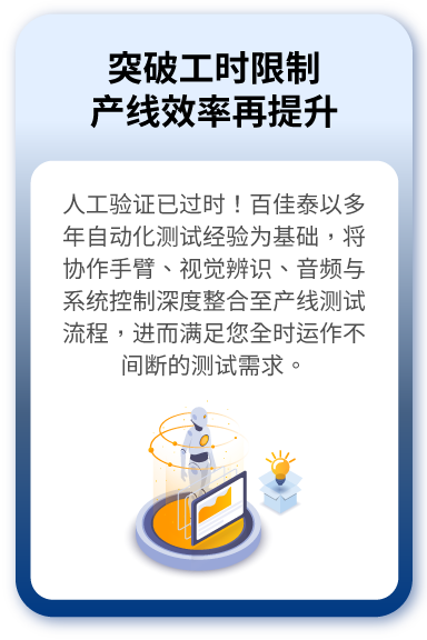 ⾯对多协议、多装置类型且环境敏感的网通装置,百佳泰将「实体操作+ App控制+ 无线验证+ 影像/⾳讯分析」整合为单⼀⾃动化测试流程,以⼀致性、可复制、可追溯的⽅式执⾏⼤量测试,⼤幅降低⼈⼯成本并提供产线质量稳定度