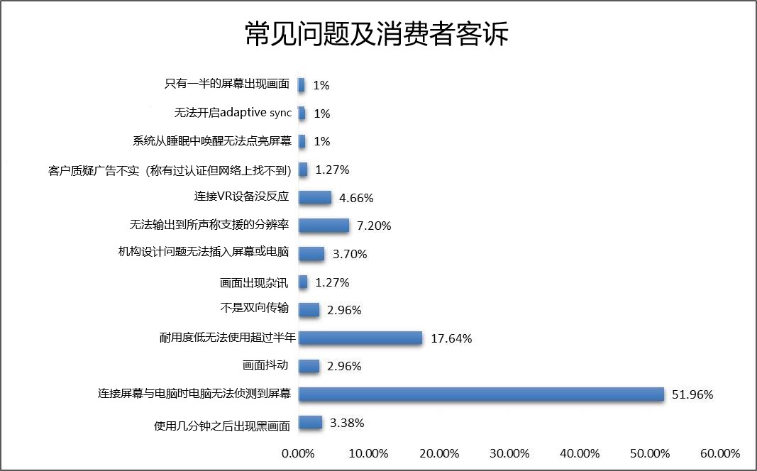 此类问题最令使用者头痛,透过该品牌的转接线或是转接头连接系统与屏幕时,直接没有画面,在设备管理器下面都侦测不到,对于消费者来说就像是花了时间与金钱,却得不到好的效果。如状况稍微好一点的,则是可以抓到但是使用几分钟之后就出现了黑画面,令客户还要想办法去抓出到底是哪里出了问题,徒增使用者的困扰。另外产品耐久度也是一个考虑重点,很多消费者指出产品在使用一到半年之内就直接挂掉,产品都还在保固期内,但质量却不佳,要退货也是造成使用者的麻烦,也直接影响到品牌的声誉及获利。