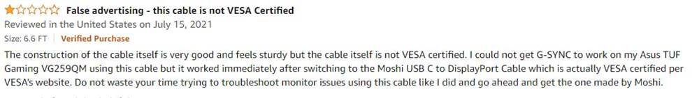 另外,笔者也发现了一个相当特别的使用者回馈,也就是广告不实的问题,部份消费者在该产品官网以及Amazon上都提出了该产品没有过VESA认证的质疑,但该品牌都没有出面辟谣,相对的有些厂牌因有通过认证,可以因为协会的认证而让消费者更相信线材的质量和避免不必要的麻烦。